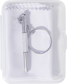 Kompaktní sada na opravu brýlí v průhledné PP krabičce. Včetně čisticího hadříku ze 100% RPET mikrovlákna (220 g/m2) a mini šroubováku s klíčenkou. Rozměr hadříku: 18×15 cm.
