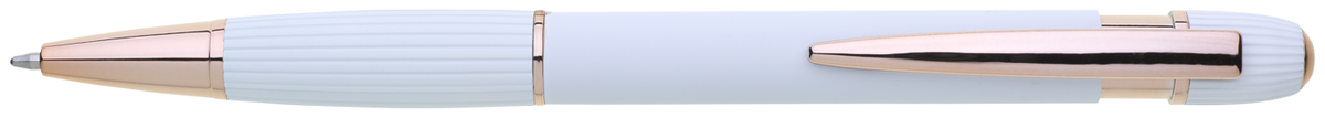 propiska z recyklovaného hliníku se soft povrchem a doplňky v růžovo-zlaté barvě. Laserované logo je lesklé, růžovo-zlaté. Náplň modře píšící. Výsledný efekt laserového značení je lesklý, v barvě doplňků.