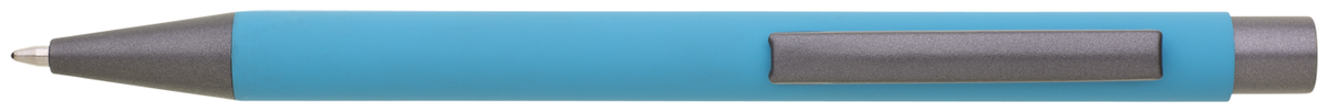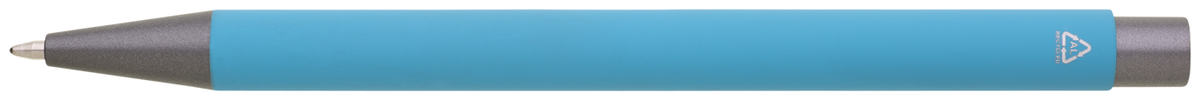 Kovová propiska CAGERI SOFT RE z recyklovaného hliníku s hnědo-černými doplňky, s oranžovým pogumovaným povrchem. Velkoobsahová modrá náplň.