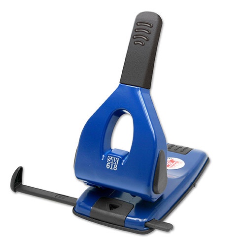 Velký stolní celokovový děrovač. Děrovač s kapacitou až 65 listů, průměr otvoru 5,5 mm, rozteč otvorů 80 mm. Úspora 50 % síly!!! Plastový příložník. Barevné provedení: modré.