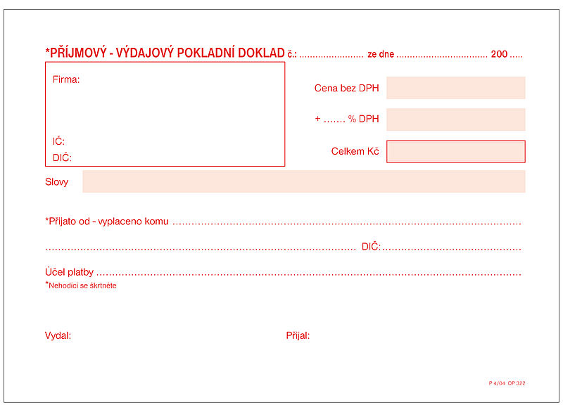 Přímopropisující tiskopis. Je přizpůsoben pro EET evidenci. Vnitřní listy s červeným tiskem. Lepený blok.