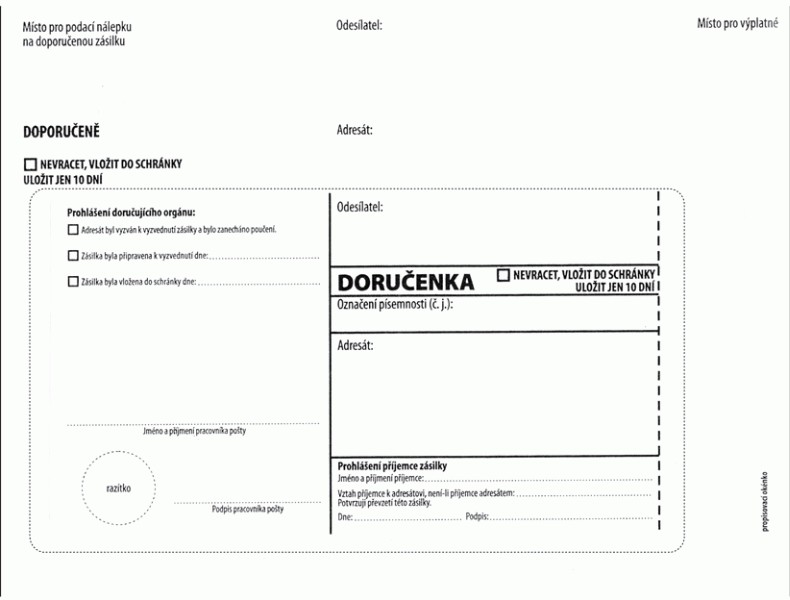 Obálky pro doručování podle zákona 500/2004 Sb. (správní řád), platného od 1.1.2006 Z nového znění správního řádu vyplývá povinnost používat pro zasílání písemností obálek s doručenkou a s poučením o právním dopadu případného odmítnutí zásilky.