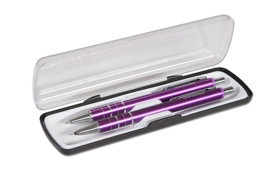 Dárková sada kuličkového pera a mechanické tužky 0,5 mm dodávaná v plastové krabičce, lesklé tělo z eloxovaného hliníku, plastová náplň A3 modrá. Barevné provedení: vínové.