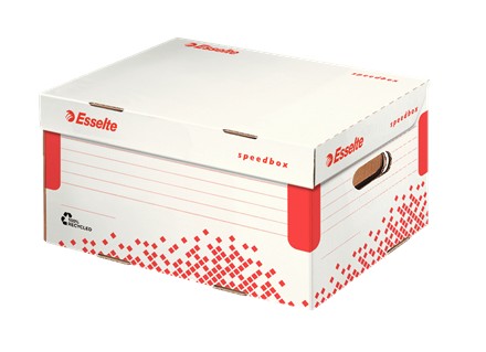 Archivační systém krabic Speedbox šetří čas a energii při skládání. Složení trvá pár vteřin, jedním pohybem, bez potřeby manuálu. Zesílené stěny i dno pro maximální pevnost a odolnost při stohování. S integrovaným víkem. K archivaci dokumentů formátu A4 i Foolscap, desek na spisy A4, časopisů, katalogů i různých kancelářských předmětů.. Vyrobeno ze 100% recyklované vlnité lepenky, 100% recyklovatelné, Certifikováno FSC. Rozměr: 355 x 252 x 193 mm. Provedení bílo-červené, A4 s víkem.