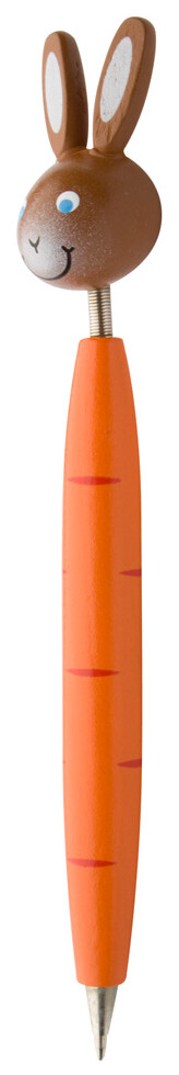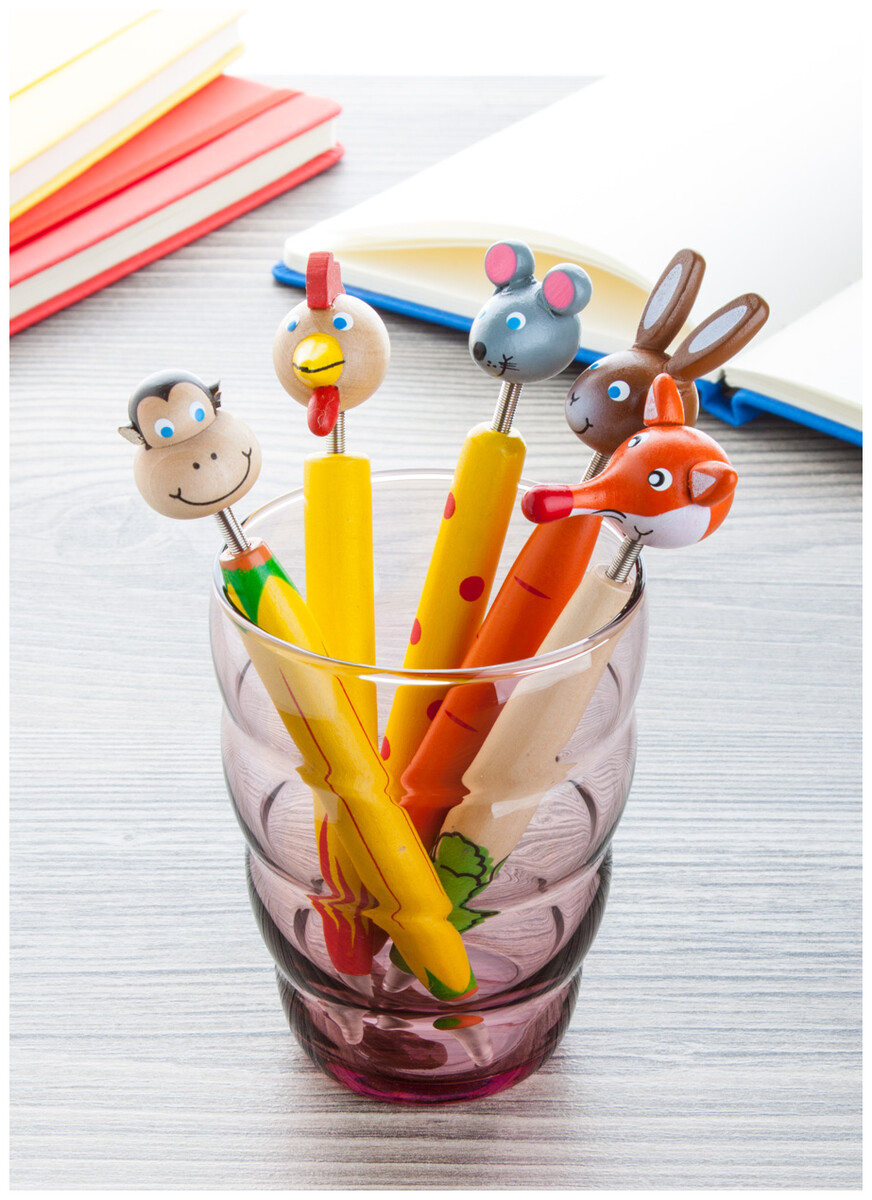 Dřevěné kuličkové pero s barevnou hlavičkou zvířátka, s modrou náplní.
