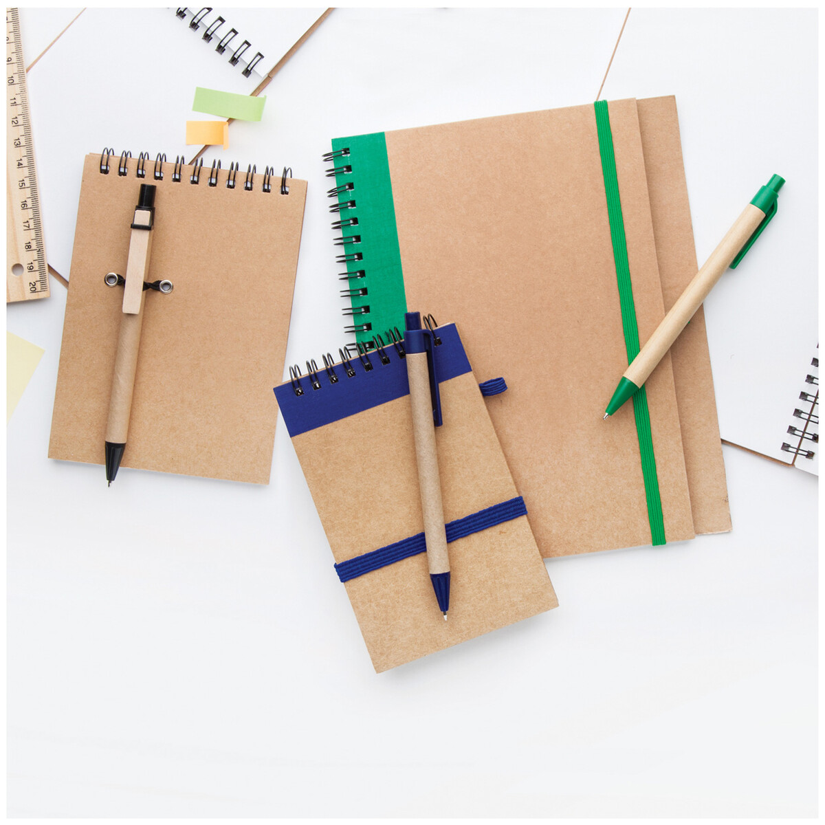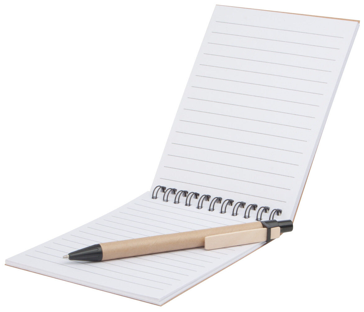 Poznámkový blok se 60 linkovanými listy a s kuličkovým perem, vyrobeno z recyklovaného papíru.