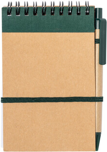 Blok ve spirále z recyklovaného papíru se 70 linkovanými listy a kuličkovým perem z recyklovaného papíru s modrou náplní. Velikost A6.