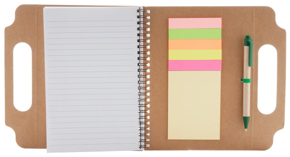 Poznámkový blok z recyklovaného papíru se spirálovou vazbou a se 70 linkovanými listy, kuličkovým perem a samolepícími poznámkovými lístky (125 malých a 25 velkých).