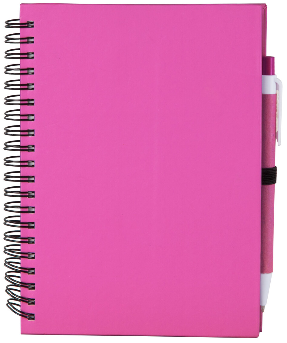 Poznámkový blok se 70 čistými listy a spirálovou vazbou v kartonových deskách, vč. stejně barevného kuličkového pera z recyklovaného papíru s modrou náplní.