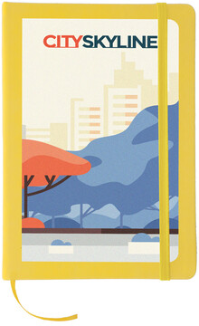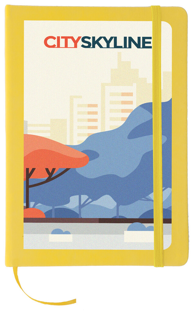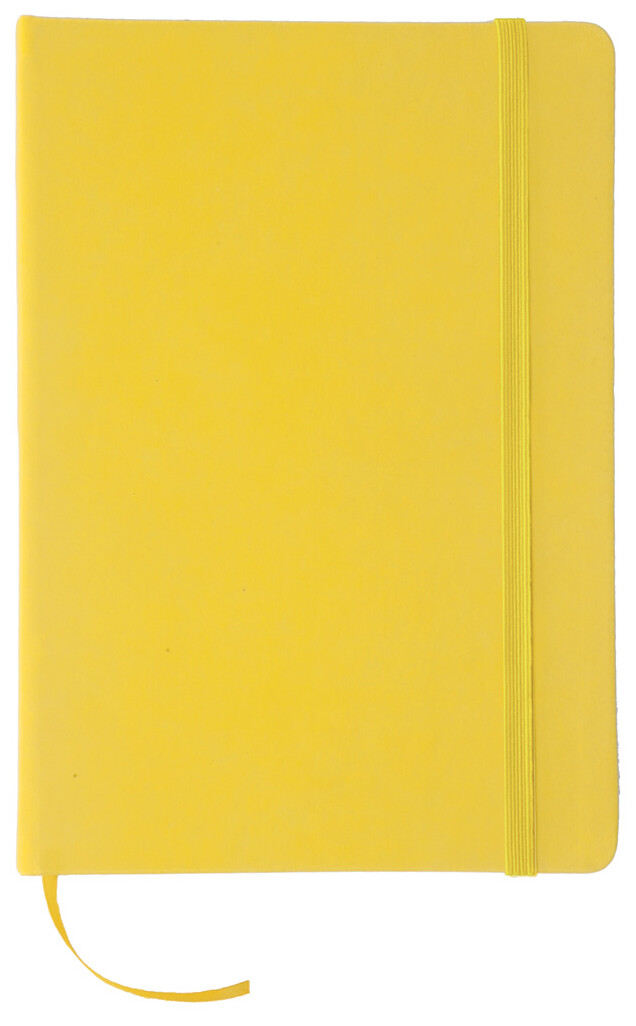 Poznámkový blok se 100 listy, záložkou a gumičkou.