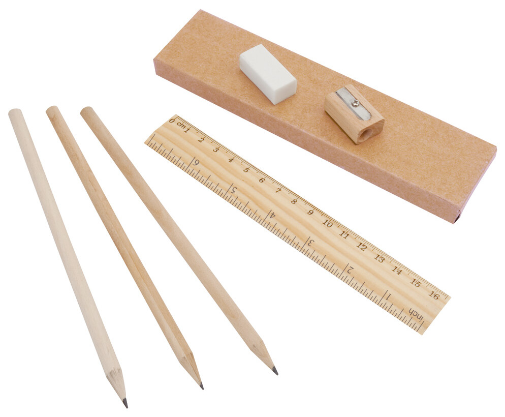 3 grafitové tužky, pravítko, ořezávátko a guma v kartonové krabičce.