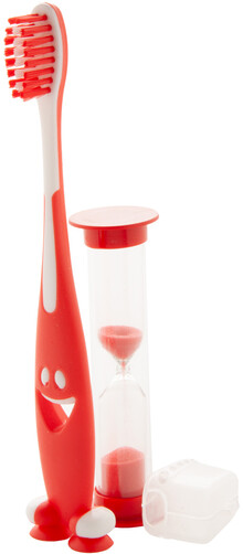 Sada na čištění zubů pro děti s plastovým kartáčkem a přesýpacími hodinami, v obalu na zip.
