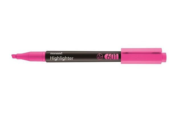 Monami 601 jsou zvýrazňovače, které se pohodlně drží, kulaté plastové tělo je příjemné na dotek. Stopa je stálobarevná od začátku do konce, nedochází k blednutí inkoustu na papíře. Ideální na zvýrazňování, malování, vybarvování. Rovnoměrná růžová stopa inkoustu se udrží na kopiích, klasickém ale i faxovém papíře. Seříznutý hrot 5 x 1 mm. Víčko v barvě náplně s klipem k uchycení, zabraňuje kutálení z polic nebo jiných nerovných míst.
