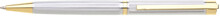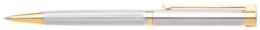 Elegantní stříbrná propiska s jemným dekorem a zlatými doplňky. V horní části je místo bez dekoru pro umístění loga. Značka Gabrielis. Otočný mechanismus, kovová velkoobsahová náplň.
