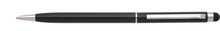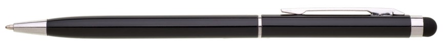 Tenká černá kovová propiska s otočným mechanismem a touch koncem. Stříbrné, chromové doplňky, náplně cross, modře píšící. Materiál hliník.