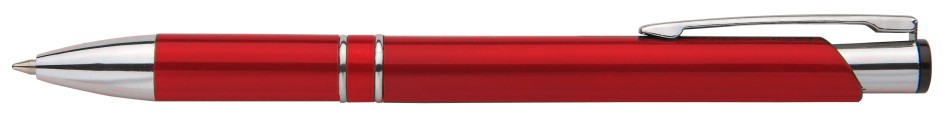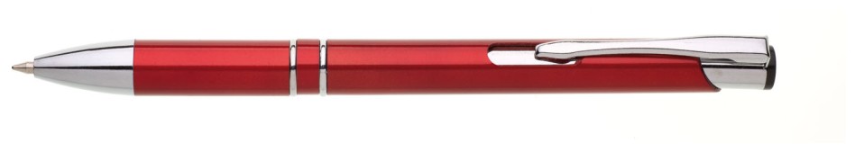 Plastové propisovací pero OIRA - červené. Pero je zdobené dvěma stříbrnými proužky. Na těle je zdobeno oválným výřezem. Pero má náplň velkoobsahovou, modře píšící.