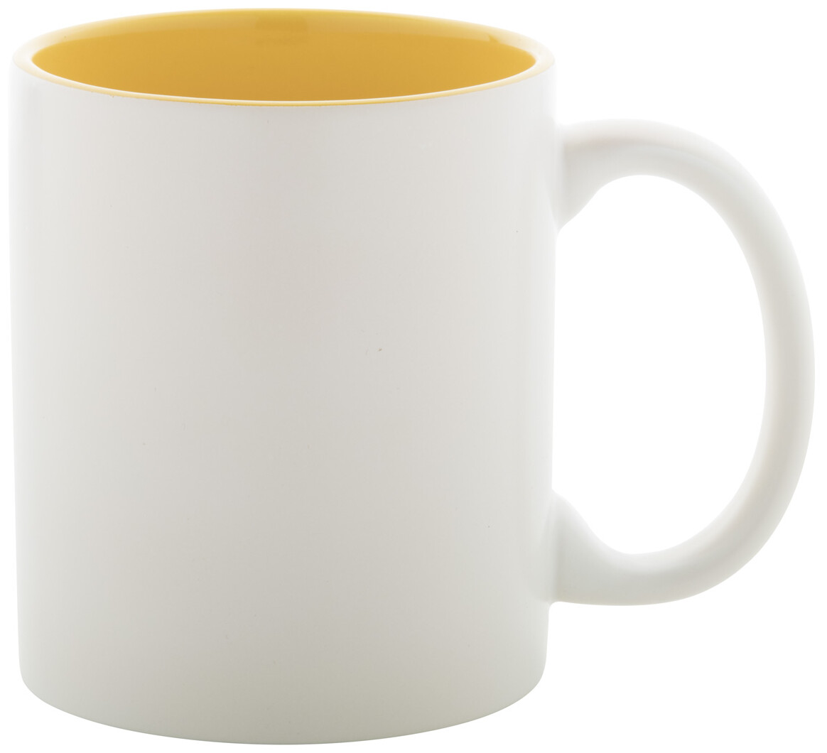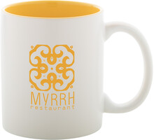 Witte keramiek mok met gekleurde binnenkant, de gegraveerd kleur is hetzelfde als de kleur van de binnenkant. In geschenkverpakking. Inhoud: 350 ml.