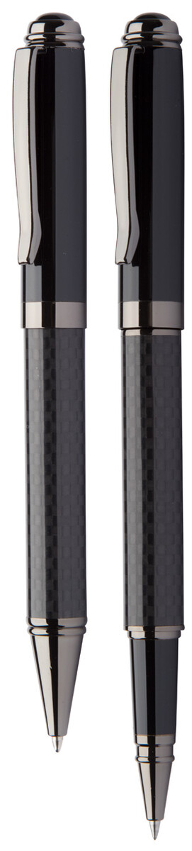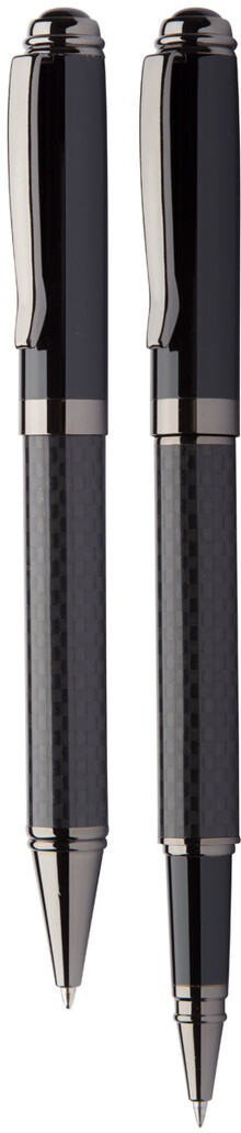 Elegantní sada kovového kuličkového pera a rolleru s karbonovým tělem. V černé dárkové krabičce, s modrou náplní. Značkový produkt André Philippe.