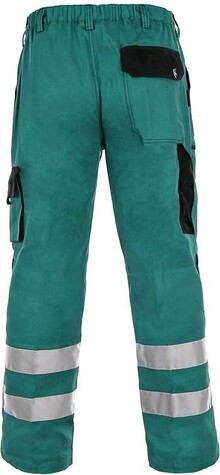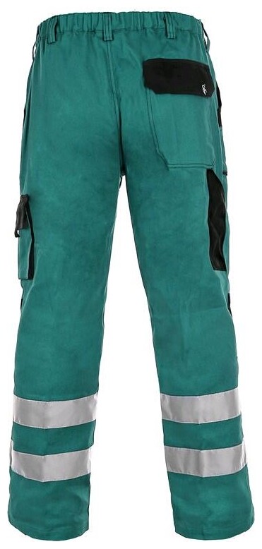 Pánské montérkové kalhoty, pas s poutky na opasek, vzadu do gumy, přední kapsy, boční kapsa na svinovací / skládací metr, boční kapsa na mobil / peněženku, zdvojená kolena, zadní kapsa s klopou, reflexní pruhy.