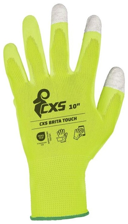 Pletené bezešvé rukavice z polyesteru, s tenkou vrstvou polyuretanu v dlani a na prstech.V koncích palce, ukazováčku a prostředníku měděné vlákno pro práci s dotykovými displeji.