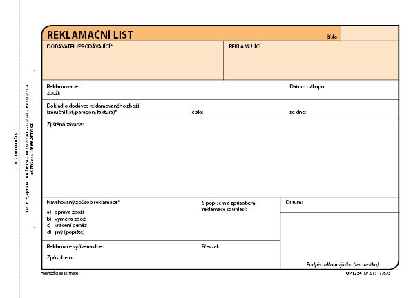| OPT-1254 | REKLAMAČNÍ LIST A5/100l samopropisovací | 122,02 Kč | 147,64 Kč | 1 ks | |||