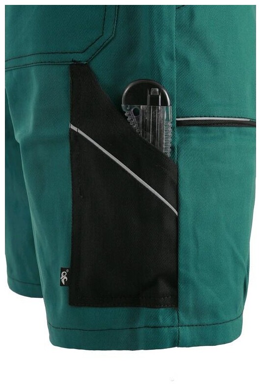 Pánské montérkové kraťasy, pas s poutky na opasek, vzadu do gumy, přední kapsy, boční kapsa na svinovací / skládací metr, boční kapsa na mobil / peněženku, zadní kapsa s klopou.