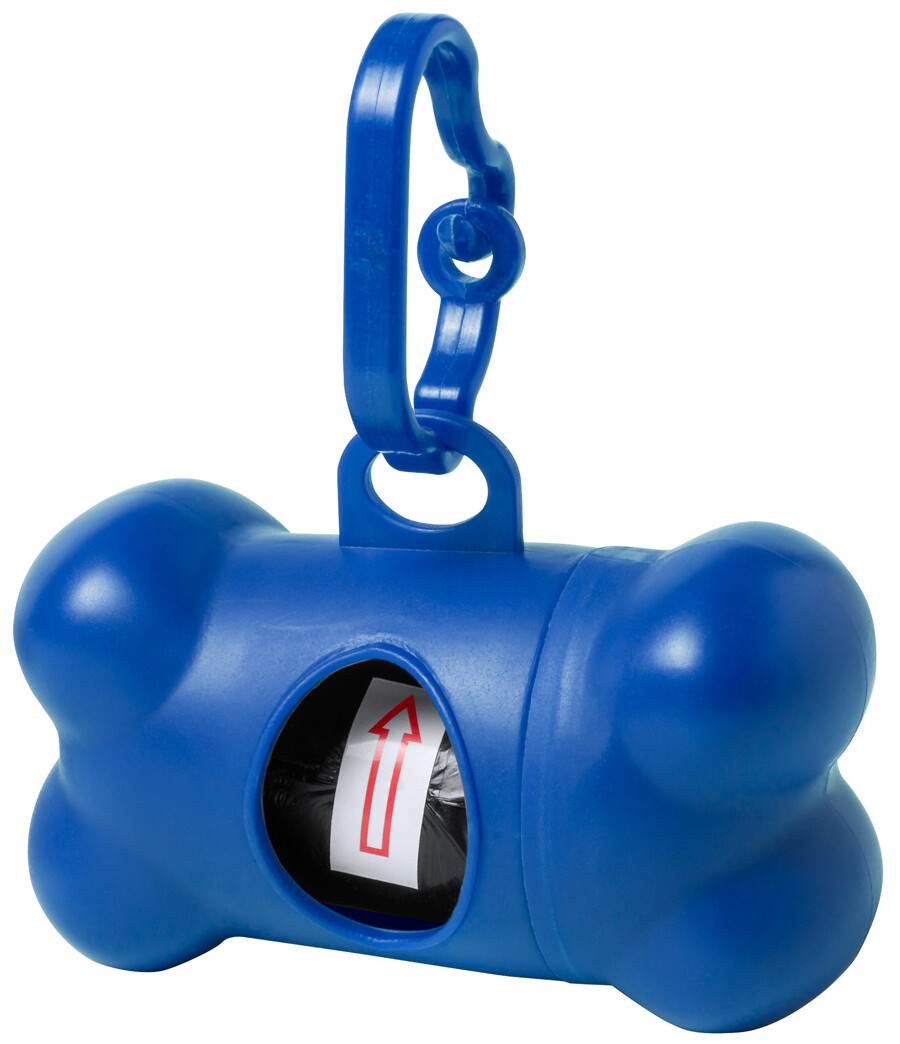 Plastový zásobník ve tvaru kosti s 15 pytlíky na psí exkrementy s karabinkou.