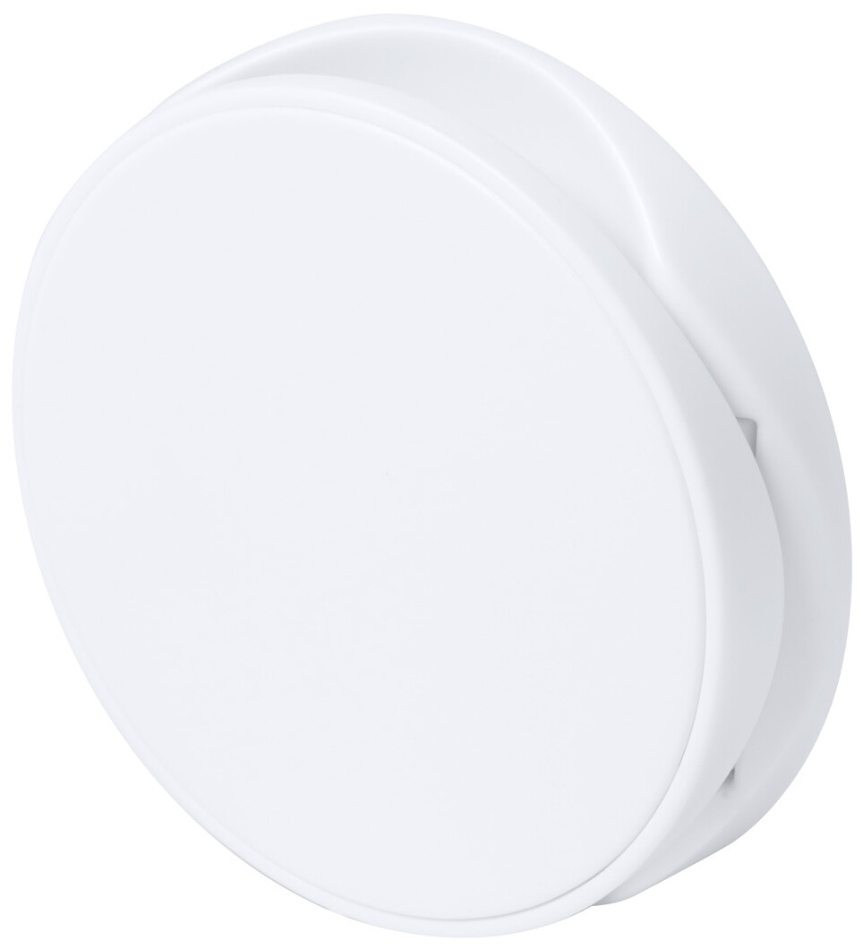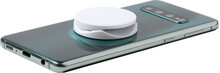 Kulatý, plastový stojánek na mobil s kroužkem na prst se samolepící stranou.