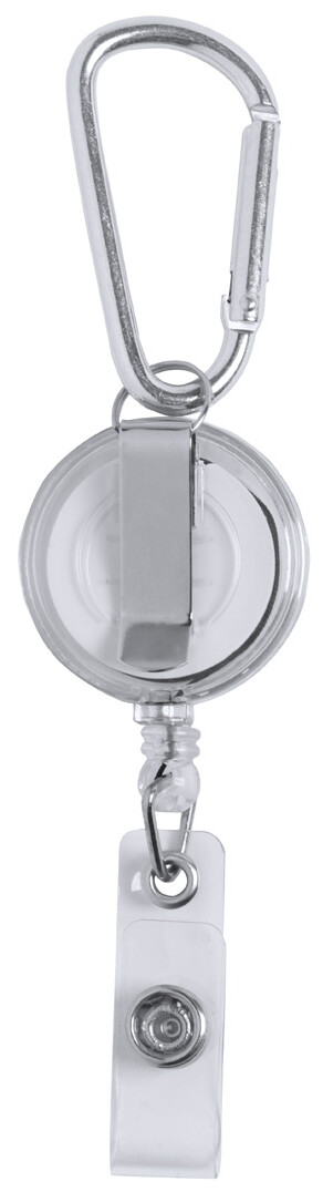 Plastový teleskopický držák na průkaz, se zapínámím na cvoček a hliníkovou karabinkou.