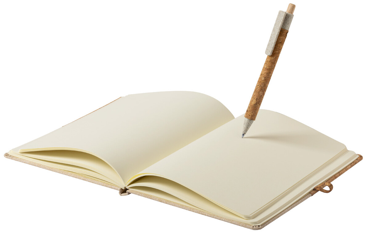 Blok A5 s deskami z přírodního korku a bavlny a 80 čistými listy. Vč. kuličkového pera z korku a pšeničné slámy, s černou náplní.