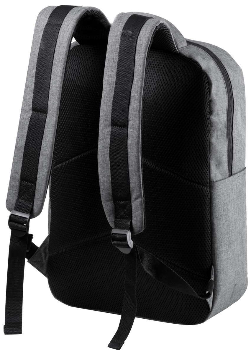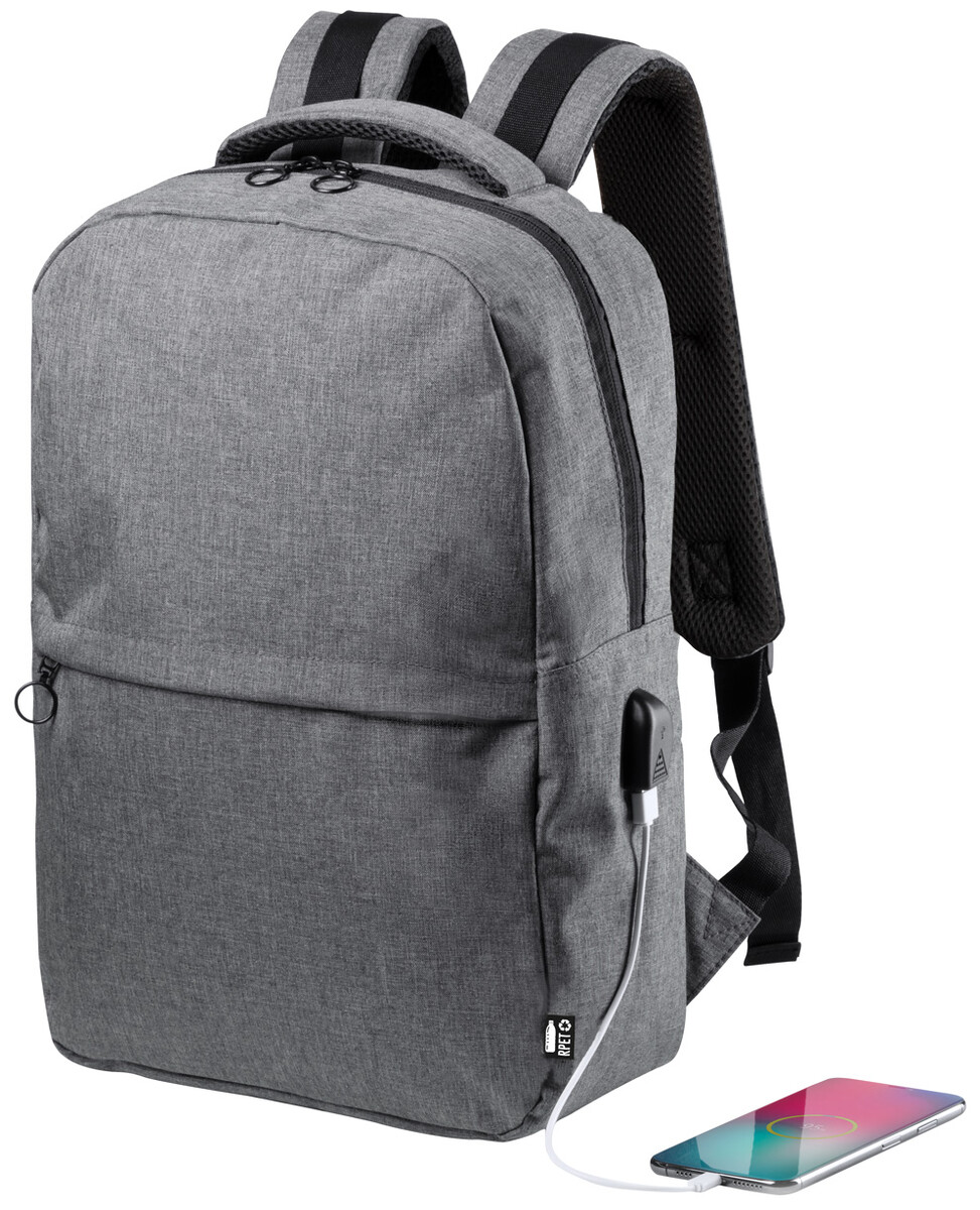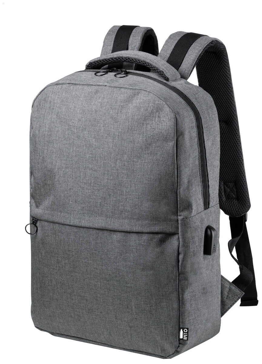 Batoh s přihrádkami na zip, polstrovaným prostorem pro notebook (15 ") a tablet (10"), polstrovanými zady a ramenními popruhy. Se zabudovaným USB připojením pro power banky. 600D RPET polyester, s etiketou s označením RPET.