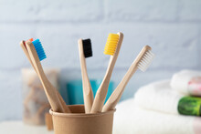 Kartáček na zuby pro dospělé z bambusu a barevnými nylonovými štětinami a barevným koncem držadla. V kraftové papírové krabičce.