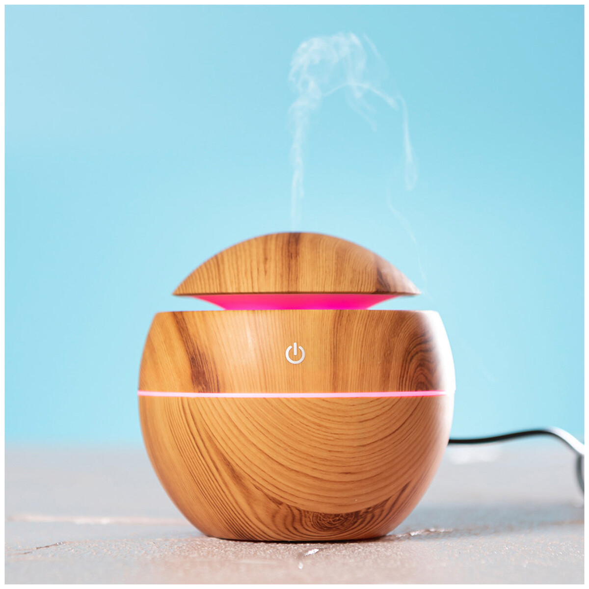 Zvlhčovač vzduchu, plast/dřevo s vícebarevným LED světlem. Vč. USB nabíjecího kabelu. Obsah 130 ml. V dárkové krabičce.