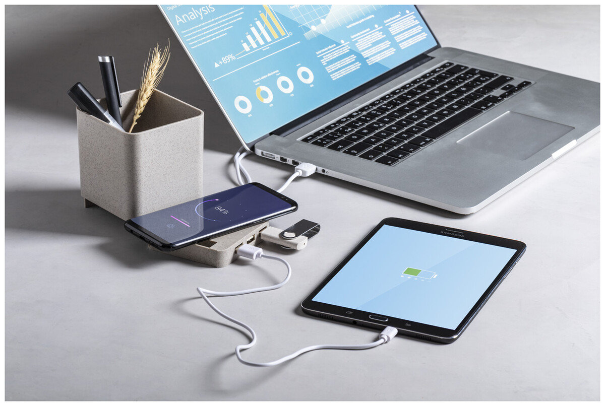 Multifunkční stojánek na pera z ekologického plastu z pšeničné slámy s držákem na mobilní telefon, bezdrátovou nabíječkou (5W) a 3portovým USB rozbočovačem (USB 2.0). Včetně kabelu USB.