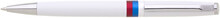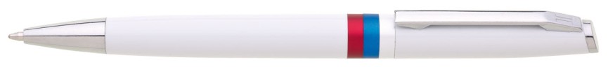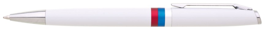 Bílá otočná propiska s trikolórou a tiskem znaku Slovenské republiky. Náplň velkoobsahová, modře píšící.