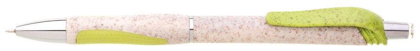 Propiska s plastem s podílem pšeničné slámy v přírodní barvy se světle zeleným klipem a barevným gumovým úchopem. Náplň X20, hrot 0,5mm.