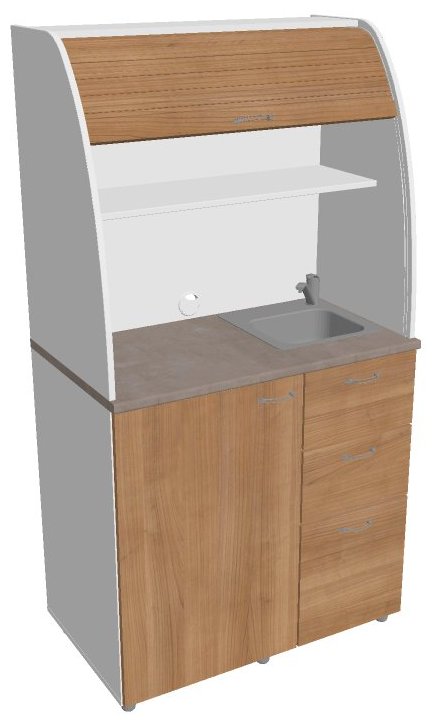 Dvě police ve vrchní části kuchyňky poskytují dostatečnou kapacitu pro vaše skleničky, hrnky či talíře. Na pracovní desku můžete umístit např. kávovar a kabelovou průchodkou v zadní části vyvedete přívodní kabel z prostoru kuchyňky.