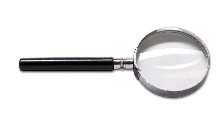 Lupa s kovovým rámečkem a skleněnou čočkou. Rozměry: průměr 40 mm, výška 10 mm, délka 12,2 cm, zvětšení 10 x.
