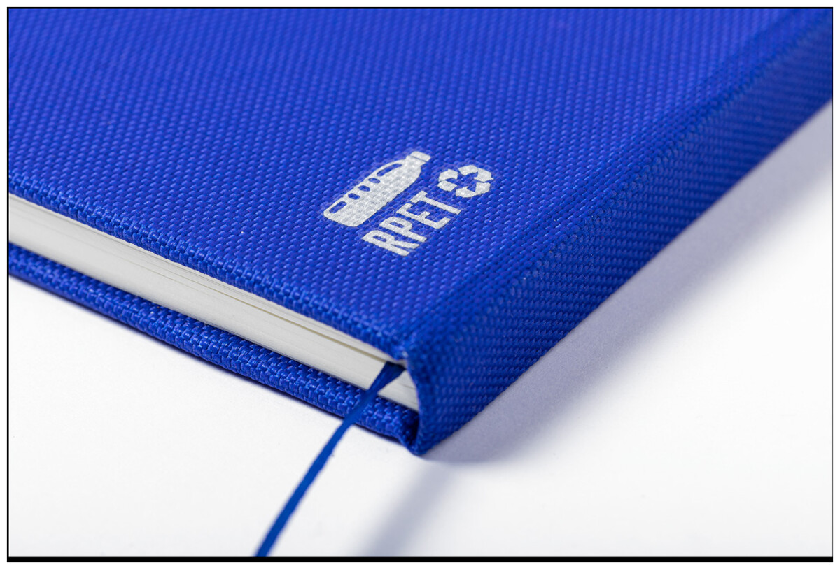 RPET blok A5 potažený polyesterem s 80 linkovanými listy, záložkou a gumičkou.