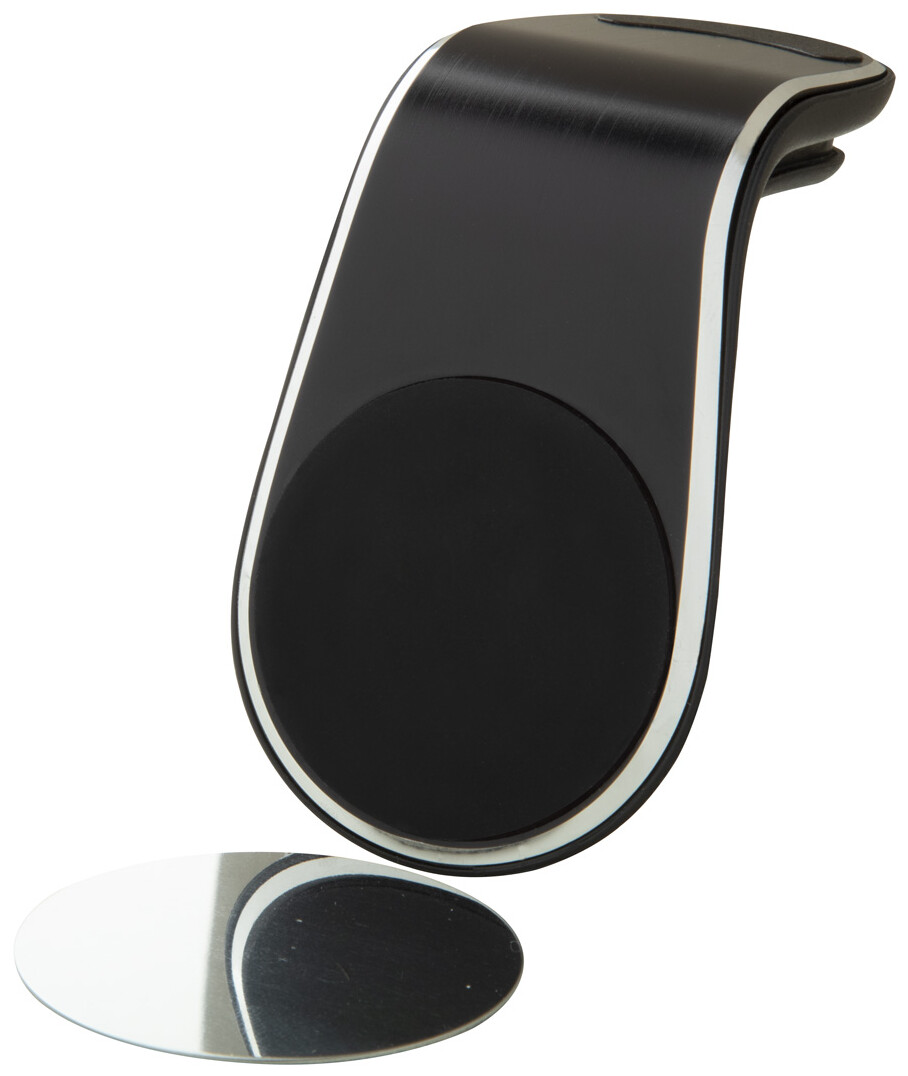 Hliníkový magnetický držák na mobilní telefon do auta s upevněním do větracího otvoru. Včetně samolepicího kovového plíšku.