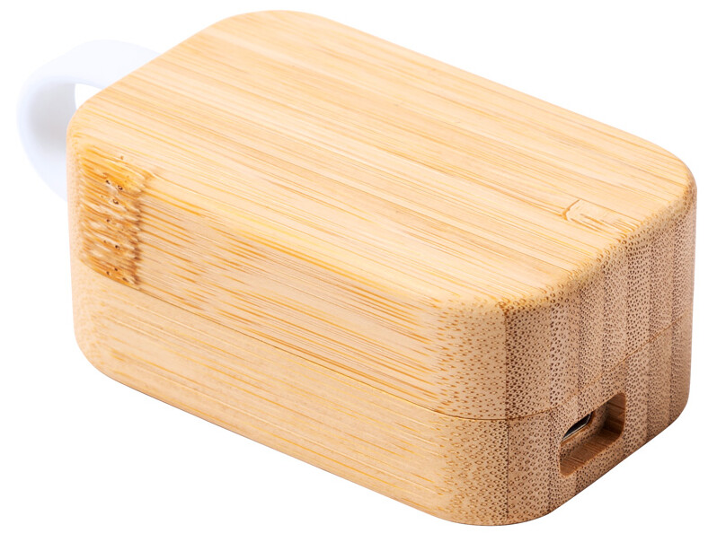 Skutečná bezdrátová stereofonní sluchátka (TWS) s funkcí hands-free volání v bambusovém nabíjecím pouzdře. Včetně nabíjecího kabelu USB.