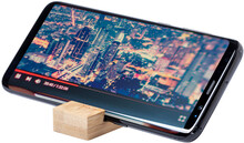 Bambusový stojánek na mobil s přívěškem na klíče.