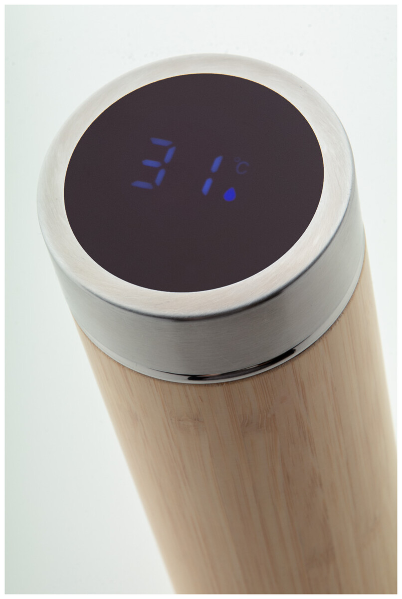 Dvoustěnná nerezová a bambusová termoska s čajítkem a dotykovým LED teploměrem na víčku. 500 ml. S knoflíkovou baterií.