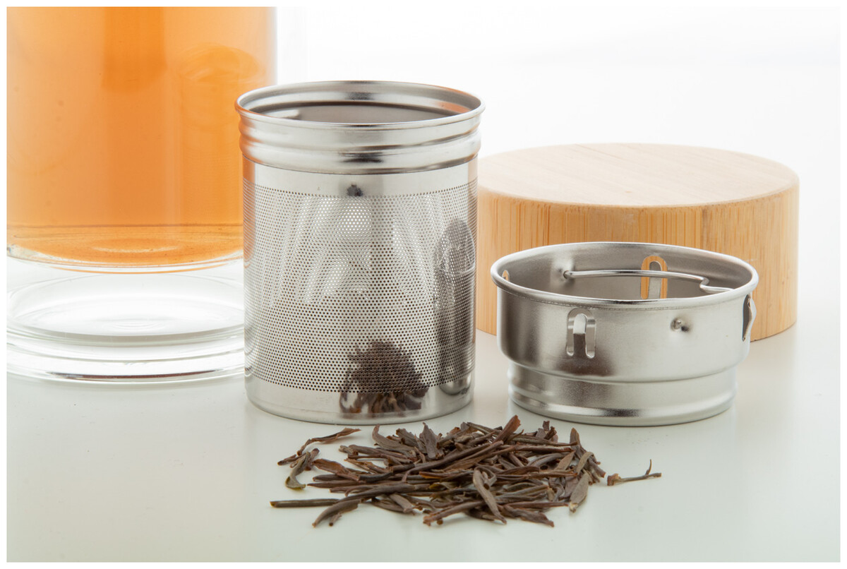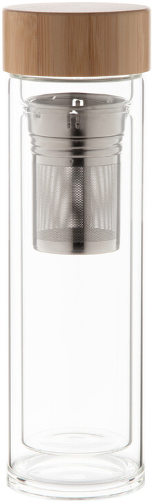 Dvoustěnná, izolovaná láhev z borosilikátového skla s čajovým spařovačem a bambusovým víčkem. 420 ml.