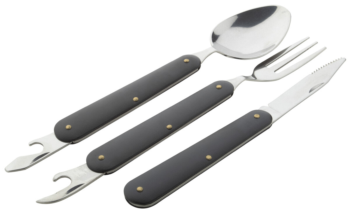 Skládací kempingová příborová sada z nerezové oceli s hliníkovými držadly, 300D polyester. Včetně vidličky, nože a lžíce. V černém obalu.