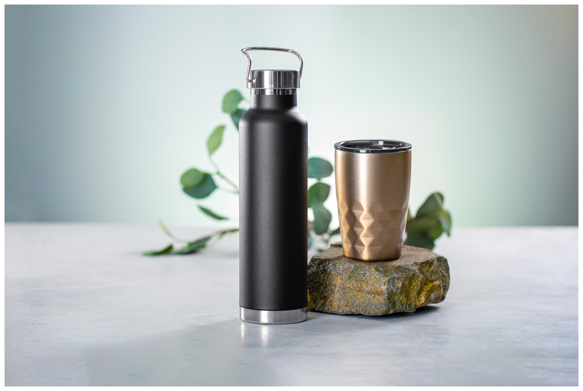 Dvoustěnná nerezová, mědí izolovaná termoska s přenosným víčkem, 650 ml. Měděná izolace udrží nápoje horké 12 a studené 24 hodin.