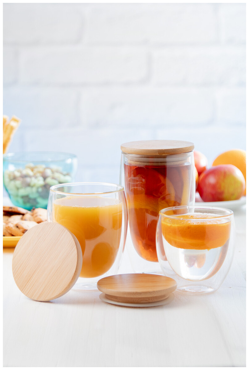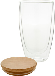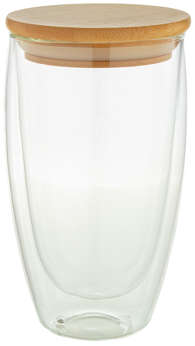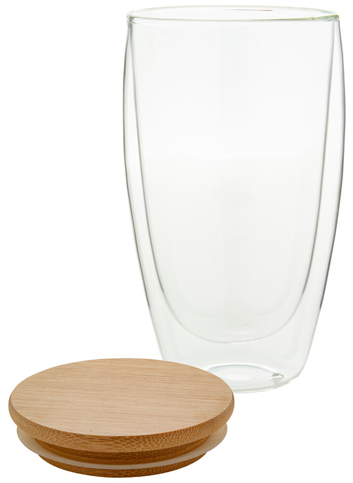 Dvoustěnný termohrnek z borosilikátového skla s bambusovým víčkem, 420 ml. V kraftové papírové krabici.
