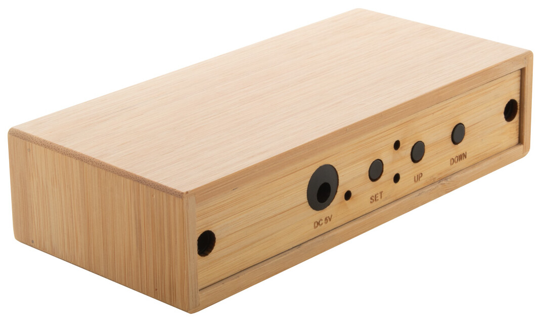 Multifunkční budík v bambusovém pouzdře s LED displejem, teploměrem a vestavěnou bezdrátovou nabíječkou (10W). Včetně USB nabíjecího kabelu.