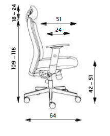 Otočná kancelářská židle se synchronní mechanikou s blokací ve zvolené pozici s pohodlným čalouněným sedákem, potaženým černou prodyšnou látkou. Výškově stavitelné područky, 3D nastavitelný podhlavník, prodyšný opěrák - černá síťovina