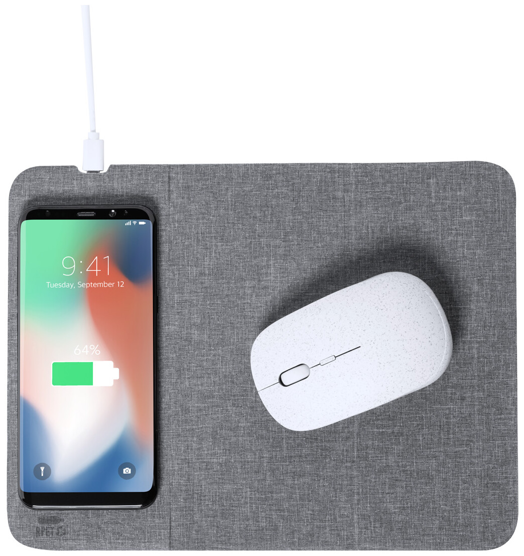Polyesterová podložka pod myš RPET s vestavěnou bezdrátovou rychlonabíječkou (10W) a funkcí držáku mobilního telefonu. Včetně USB nabíjecího kabelu.